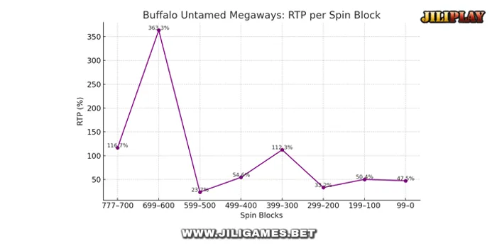 This pattern shows how Buffalo Untamed Megaways embodies high volatility — long stretches of low returns punctuated by huge spikes.
