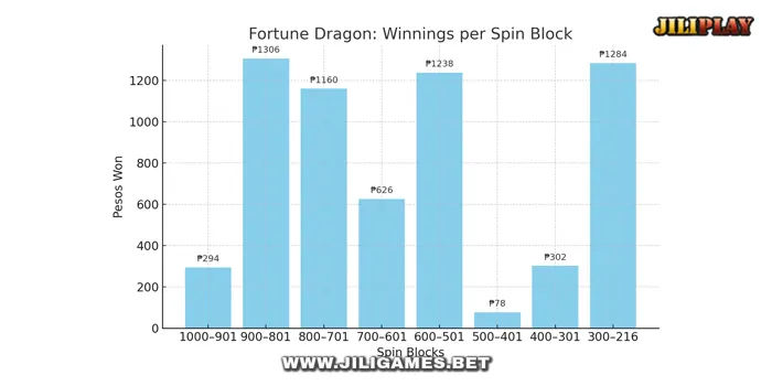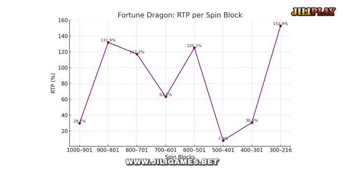 This final graph shows the RTP trend per block of spins, visualizing Fortune Dragon’s volatility over the course of the session.