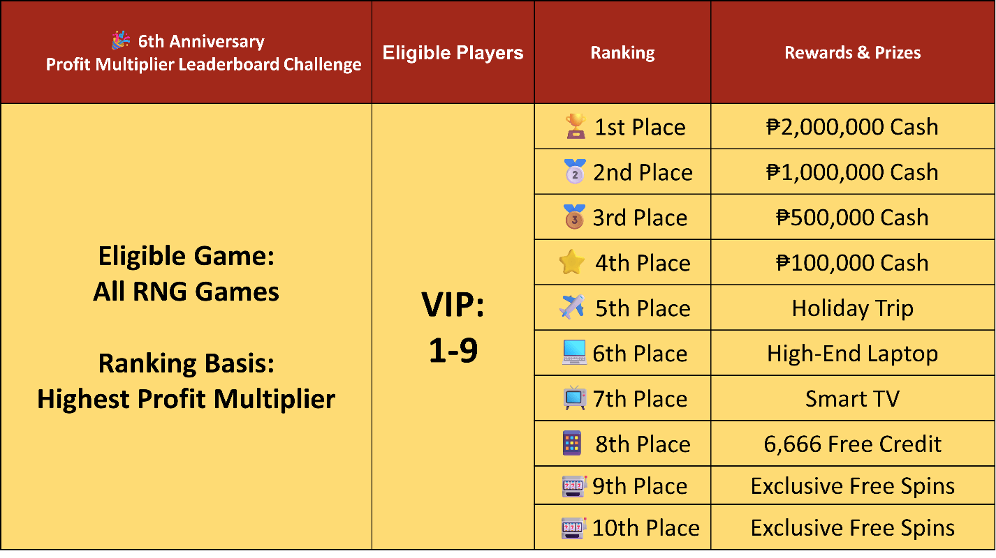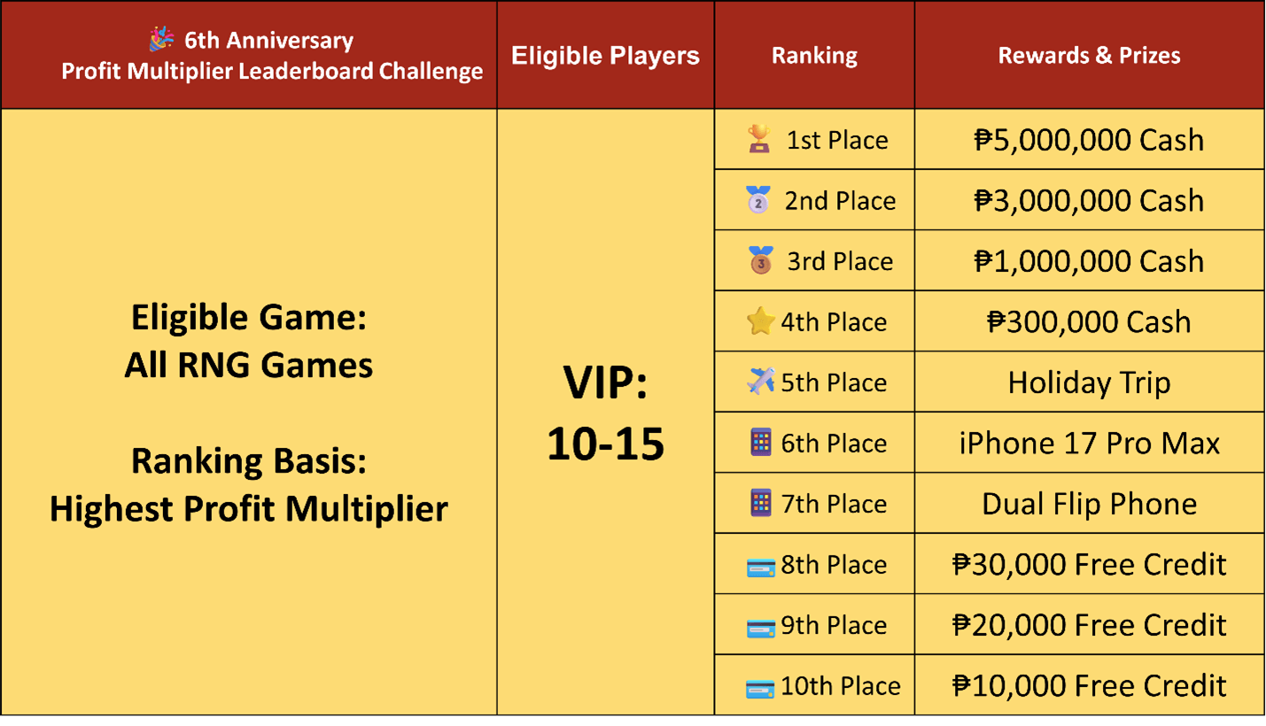 Celebrate Jilibet’s 6th Anniversary with two thrilling challenges — the Milestone Challenge and the Profit Multiplier Leaderboard. Spin more, hit milestones, and climb the leaderboard for massive rewards worth millions of pesos.